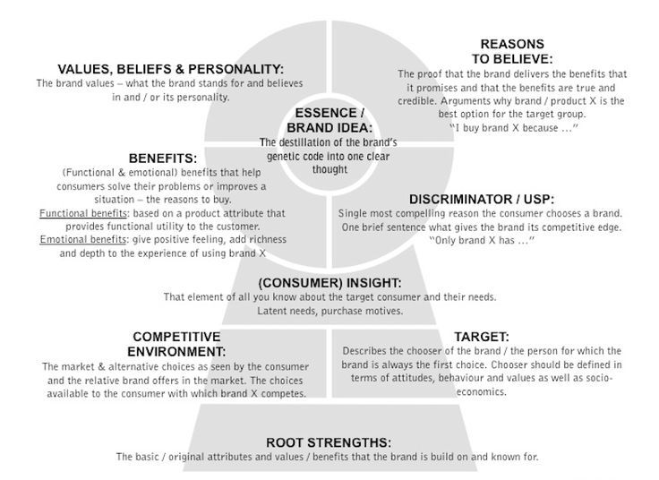 Brand strategists use the pyramid to connect day-to-day features with an inspiring vision. Each level builds on the one below: Features/Attributes: What the product does (e.g. “fast charging battery”). Functional Benefits: Customer-level value (e.g. “saves me charging time”). - Emotional Benefits: How users feel (e.g. “I feel empowered”). - Brand Persona: Humanizes the brand (e.g. “friendly tech guru”). - Brand Idea/Essence: Core promise (e.g. “simplicity in every device”).